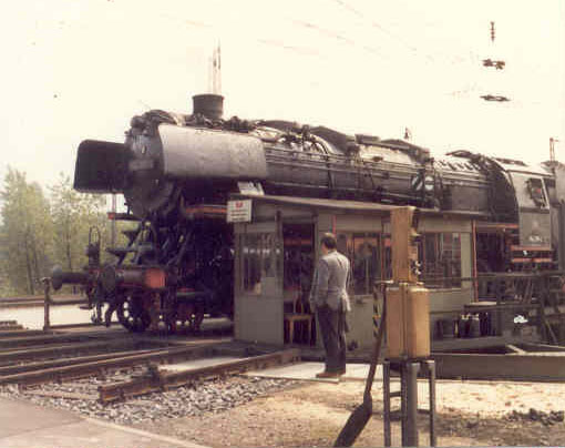 Dampflok der Baureihe 44 auf der Drehscheibe vor dem Schuppen im Bw Braunschweig, Frühjahr 1976.