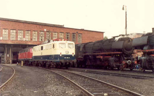 Dampf- Diesel- und E-Lok vor dem Schuppen im Bw Braunschweig, Frühjahr 1976.