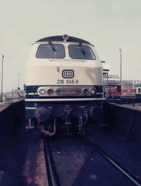216 045 auf der Schiebebühne 2 im Bw Braunschweig, Frühjahr 1976.